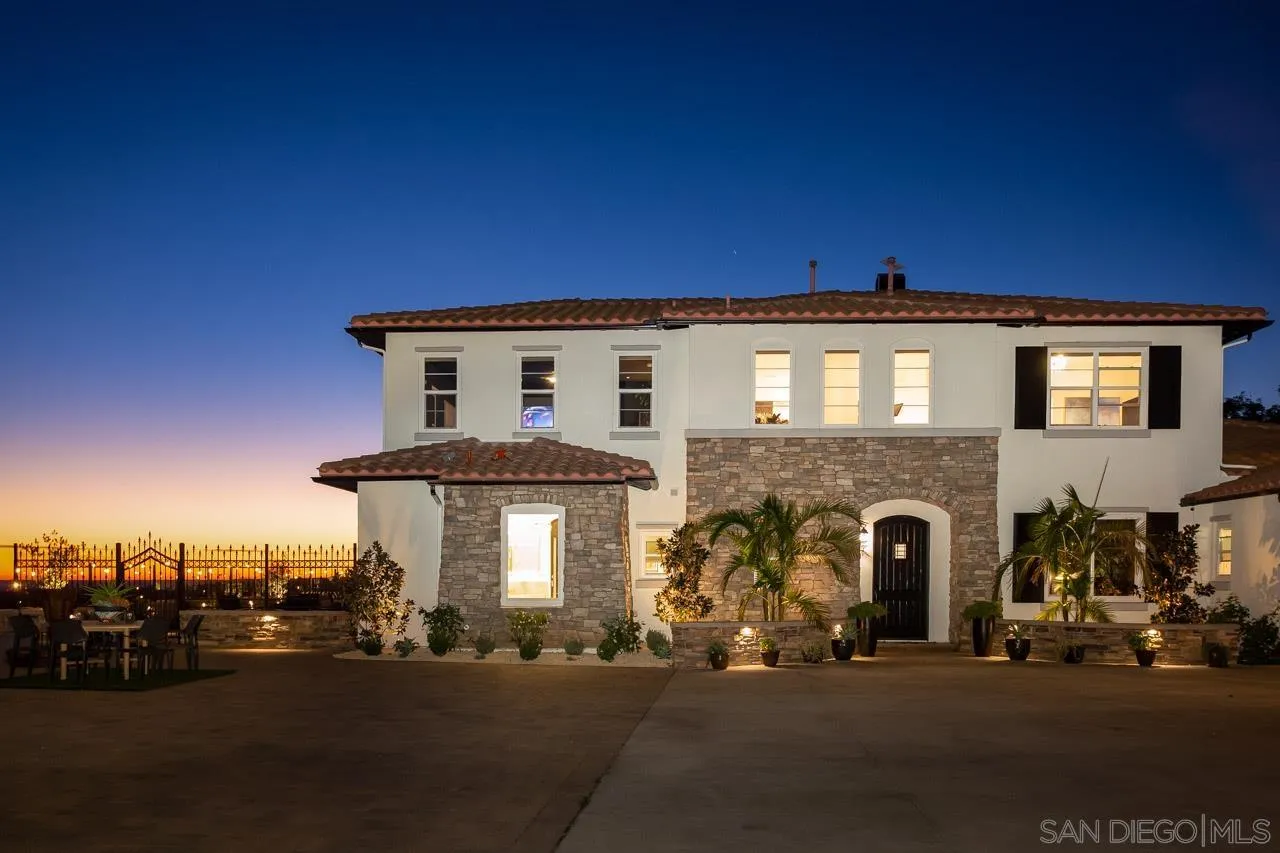 Extraordinary turnkey 2025 remodel in the coveted San Luis Rey Wine Growing Region perfectly blends traditional elegance with modern amenities. Ideally perched on a hilltop in a private, gate-guarded community, the home offers breathtaking views, cool breezes, and serene privacy. Designed for both family living and entertaining, the interior features expansive rooms, soaring ceilings, sun-filled spaces, arched hallways, and a striking spiral staircase. At the heart of the home is a chef’s eat-in kitchen with a massive island, Thermador 6-burner cooktop, convection/double ovens, Sub-Zero fridge, Bosch dishwasher, and Blanco sink—opening to a cozy family room with fireplace. The ground-floor primary suite is a private sanctuary with dual walk-in closets and a spa-inspired bath. Additional spaces include a flexible office or 4th bedroom, and an oversized theater with 120” screen. Situated on over 2 acres, the property boasts a long tree-lined driveway, courtyard, 3-car garage, multiple patios, firepits, 6-person Jacuzzi hot tub, water features, stainless steel BBQ, and a flourishing orchard with oranges, limes, figs, avocados, and more. There's even room to plant your own vineyard. Surrounded by world-class wineries, golf, and dining—including Haven’s Country Club, Monserrate Vineyard & Winery, and Harlow’s—this one-of-a-kind estate offers the ultimate in Wine Country luxury and tranquility.