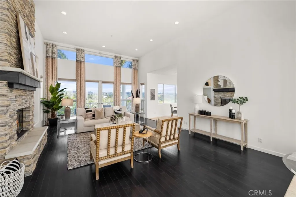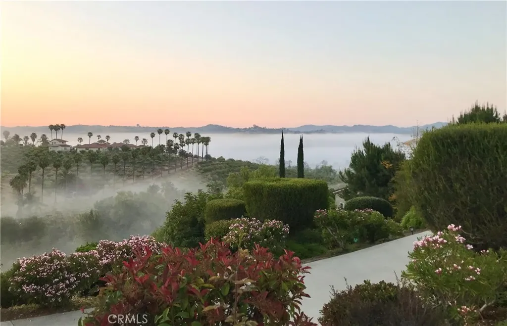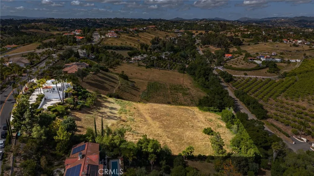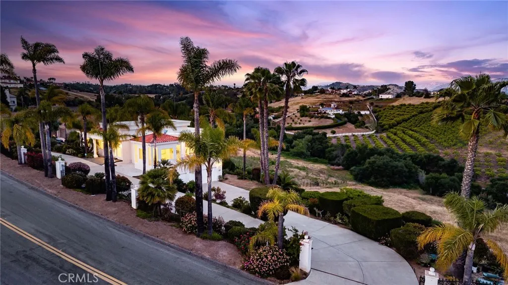 Welcome to 4462 Fallsbrae Road, an exquisite hilltop estate blending Mediterranean charm with modern luxury and eco-conscious living. Situated in the rolling hills of Fallbrook on 2.44 gated acres, this 3,930 sq ft custom home offers stunning panoramic views, timeless architecture, and seamless indoor-outdoor living just minutes from local vineyards, golf courses, and coastal attractions. A grand entrance with manicured landscaping and mature palms leads to a striking white stucco exterior, adorned with classical columns and elegant wraparound balconies. Large windows and French doors bring in abundant natural light while framing scenic vistas in every direction. Inside, soaring ceilings and dark wood floors set the stage for refined living. The formal living room features a dramatic floor-to-ceiling stone fireplace, framed by tall windows and architectural columns. An open-concept layout flows into the chef-inspired kitchen, complete with a curved granite island, gas cooktop, dual ovens, walk-in pantry, and skylight that fills the space with natural light. The primary suite offers a private balcony, spa-like bath with jetted tub, dual vanities, and custom closets. Three additional bedrooms and updated bathrooms offer flexibility for guests or home offices. An oversized laundry room provides generous cabinetry, counter space, and bright functionality. Multiple balconies and terraces encourage al fresco dining and entertaining with views of the surrounding hills and sunsets. A rooftop solar panel system enhances energy efficiency, making this home both luxurious and sustaina