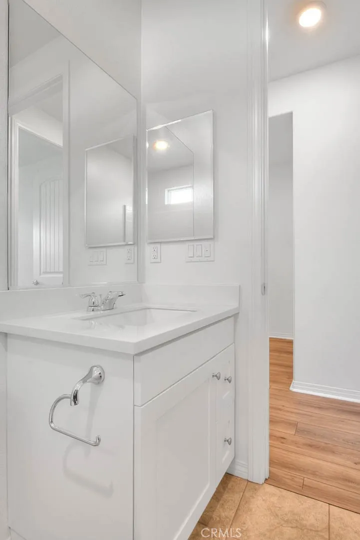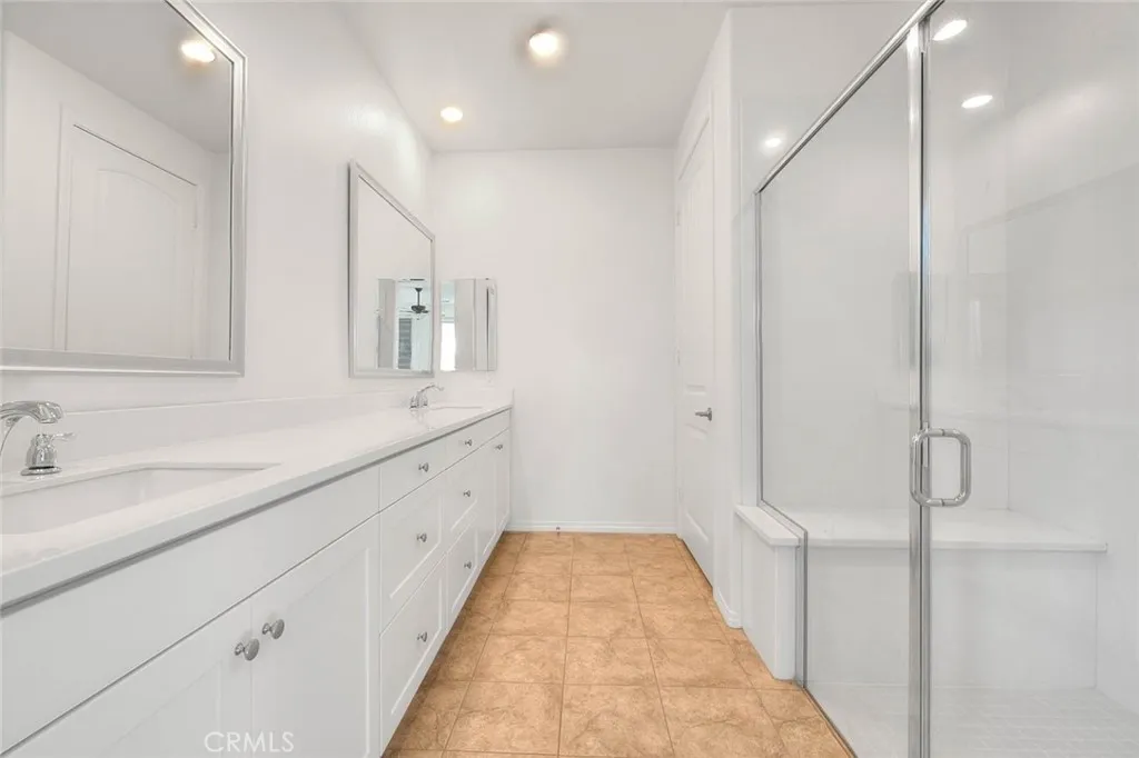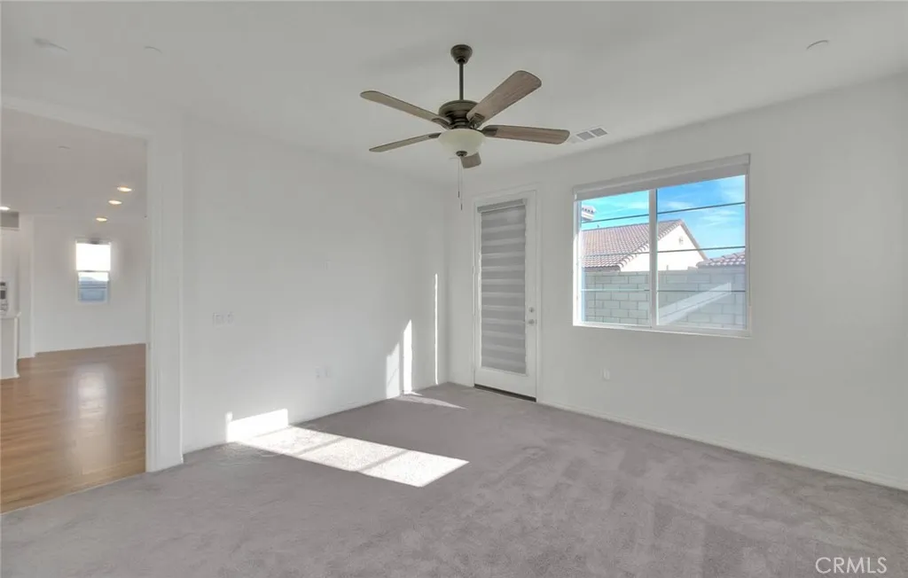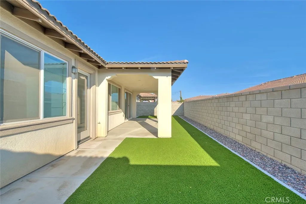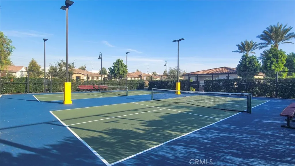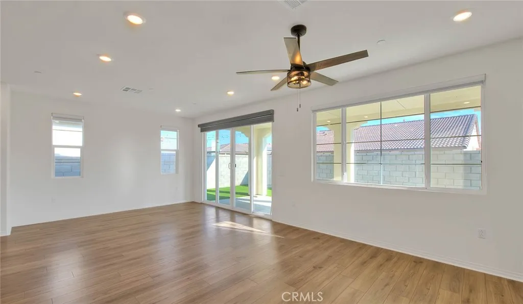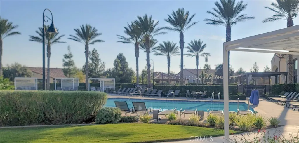 This single story, 1556 sq.ft., 2 bedroom, 2 bath home is located in highly desired, 55 plus, gated, master planned Lennar community of Esperanza in Ontario Ranch. The kitchen, dining area and family room combine to form an open concept great room. The kitchen is complete with matching stainless G.E. appliances, double oven, microwave, dishwasher, 5 burner stovetop with hood and refrigerator. The center island doubles as a breakfast bar. There is a walk-in pantry, quartz counter tops and wood-like laminate floors throughout with carpet in the bedrooms. There is a separate laundry room, multiple storage closets, ceiling fans in the bedrooms and family room, recessed lighting, a fire sprinkler system, tankless water heater, high 9 foot ceilings, and a low maintenance front yard with drought resistant vegetation. The oversized primary bedroom boasts an attached bath with a dual sink vanity, a walk-in shower, separate toilet and large walk-in closet. The spare bathroom has a tub/shower combo. The spare bedroom is carpeted and has a ceiling fan with light. Dual sliding glass doors lead to a covered patio and backyard tastefully finished with artificial turf and river rock and block wall surrounds. The HOA community includes a 9,000 sq.ft. La Jolla Clubhouse, swimming pool, fitness center, BBQ area, fire pit, pickleball courts and dog park. This home is conveniently located close to multiple retail and grocery shopping centers and Ontario Airport.