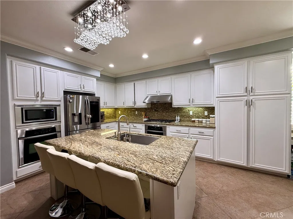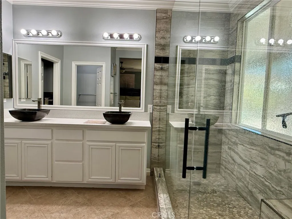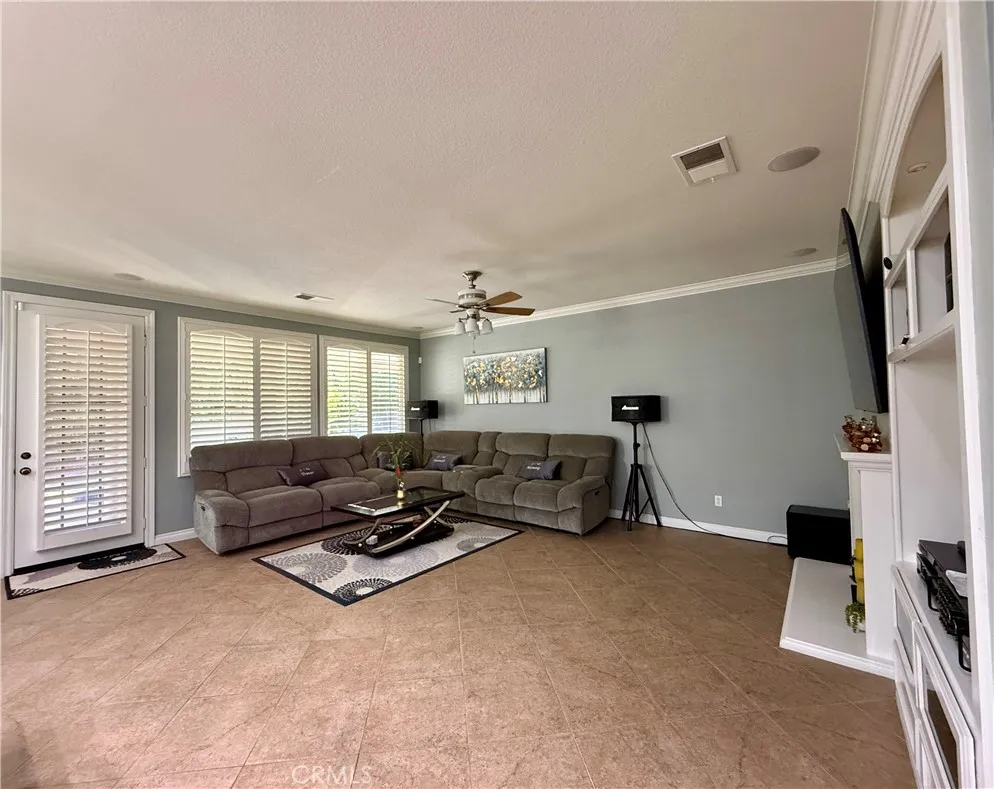 Dont miss your chance to own this beautiful home! Situated on a stunning corner lot with mature landscaping, this home has been thoughtfully upgraded with over $100K in improvements, including all bathrooms and the wood floor. Plus paid-off solar system. Step inside to find ceramic tile and wood flooring throughout, complemented by plantation shutters. The entry flows into the living and dining areas, while a huge family room with a fireplace opens to the spacious kitchen and breakfast nook. The kitchen features granite countertops, a center island, and ample cabinetryperfect for entertaining. The primary suite is a true retreat, complete with space for a nursery or home office, a luxurious upgraded bathroom with double sinks, and a fully built-in, oversized walk-in closet. Two additional bedrooms and another upgraded bathroom are conveniently located on the main floor. The home also boasts a separate laundry room with sink and a 3-car garage with epoxy flooring and built-in cabinets. Upstairs, youll find a large bedroom with a beautifully upgraded full bathroom. Step outside to your private tropical paradise, featuring: Fully covered Alumawood patio, Stone fire pit,Built-in BBQ, Luxurious stacked stone saltwater pool with waterfall. This Menifee gem offers both comfort and style, making it the perfect place to call home!