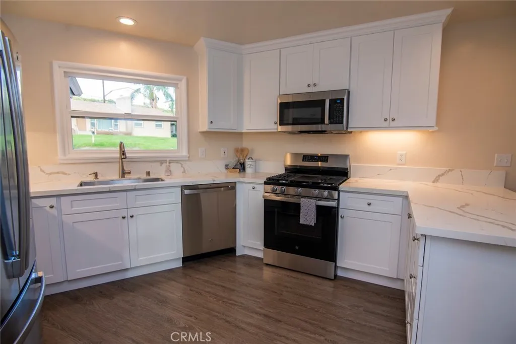 Welcome home to this spacious 3 bedroom 2 full bath home. Enter the Huge living room with cozy corner fireplace that flows into the dinning room, giving a light open "great room" feel to the living space. Next is the newly remodeled kitchen, including all new cabinets, lots of quartz counter space and tons of storage. All new Stainless steel appliances, including gas stove, microwave, dishwasher and refrigerator, finish off this great remodel. Don't miss the luxury vinyl plank flooring throughout this home that pulls it all together.. Bathrooms have also have upgraded cabinets and new fixtures. Modern upgraded lighting and ceiling fans in bedrooms, and of course central heat and AC! Add to this an enormous corner lot with low maintenance landscaping, large patio in back yard with many fruit trees just waiting for outdoor gatherings! A Two car attached garage, plus large driveway complete the picture. Located in the quiet La Sierra neighborhood of Riverside, this home is close to La Sierra University, schools, shopping and Riverwalk. Easy commute from 91 or 15 Fwy. This is a "must see" home you will want to call your own!