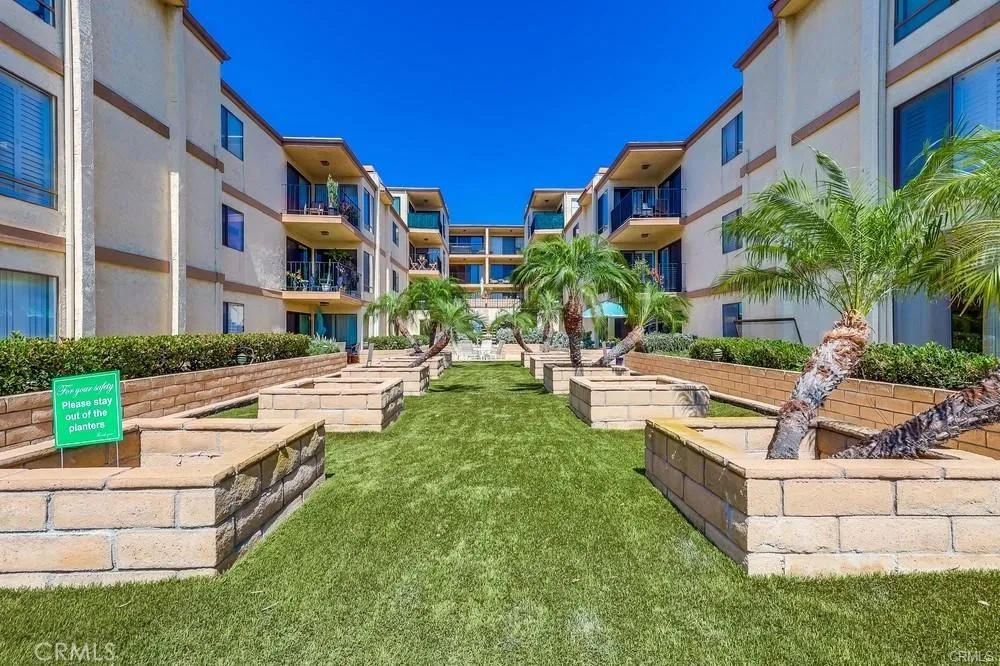 Welcome to 2722 E 20th Street #104, a spacious and light-filled Signal Hill condominium with a thoughtful layout and access to community amenities. The tiled entryway includes a storage closet before opening into the home. To the left, a hallway with built-in cabinetry leads to a full bathroom and a well-sized bedroom with a sliding closet, ceiling fan, and direct access to the bath. On the right side of the entry, the primary suite offers generous closet space, its own ceiling fan, and an ensuite bathroom featuring both a soaking tub and a glass-enclosed shower. Straight ahead, the main living area unfolds into a large, open space anchored by a white brick fireplace with a mirrored surround. A built-in bar, expansive windows, and sliding glass doors to the patio bring in natural light and create an inviting atmosphere. The living room connects easily to the dining area and kitchen, with a laundry space conveniently tucked just beyond. The private patio extends off the living area, offering a shaded, partially enclosed retreat that opens to a shared community terrace with lush greenery and direct access to amenities, including the pool. Blending comfort, functionality, and community living, 2722 E 20th Street #104 is a wonderful place to call home in Signal Hill.