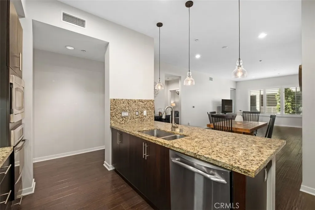 Welcome to sophisticated luxury at The Belvedere, Central Park West! Experience refined living in this stunning end-unit flat featuring 2 bedrooms, 2 bathrooms, and a private balcony. The open-concept layout showcases beautiful hardwood floors, 10-foot ceilings, and plantation shutters throughout. The gourmet kitchen is appointed with European cabinetry, slab granite countertops, and stainless steel GE appliances. Additional features include an interior laundry area with a washer, dryer, and storage. The primary suite offers a walk-in closet with built-ins and a spa-inspired bath with dual sinks and upgraded tile finishes. Located on the second floor, this home offers quiet and serene courtyard views. Two dedicated underground side-by-side parking spaces with storage complete this exceptional home. Enjoy convenient access to The Belvederes 8,000 sq. ft. clubhouse featuring a fitness center, studio, outdoor patio with fireplace and wet bar, Junior Olympic-size saline pool, two spas, BBQ pavilion, sport court, and pickleball. This sought-after prime central location is near the I-405, John Wayne Airport, world-class shopping, dining, and Southern Californias finest beaches.
