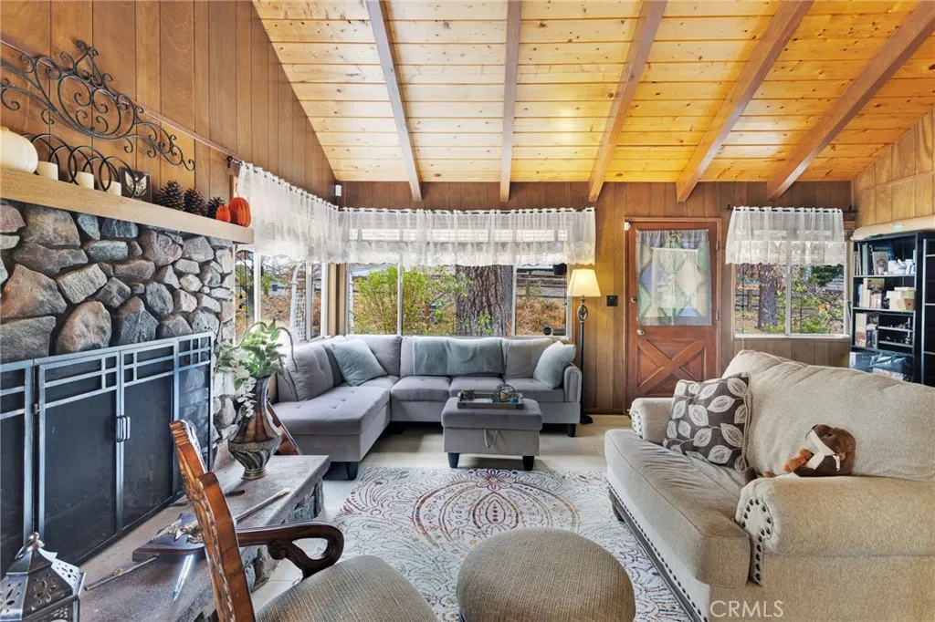 Charming Wrightwood Mountain Retreat with Vaulted Cedar Ceilings and Dual Fireplaces! Welcome to this warm and inviting home situated on a spacious 8,805 sq. ft. corner lot in the heart of beautiful Wrightwood, California. This mountain community is known for its fresh air, four seasons, and outdoor recreationincluding Mountain High Ski Resort, hiking and biking trails, fishing at nearby Jackson Lake, and charming local shops and restaurants in the Wrightwood Village area. Step inside to a large living room featuring stunning cedar beam vaulted ceilings and a cozy fireplace, creating the perfect mountain ambiance. The cedar ceilings continue into the dining area and kitchen, adding warmth and character throughout. A very spacious family room also features cedar beam vaulted ceilings, a second fireplace, and a built-in bar with a sink and refrigeratorideal for entertaining or relaxing with friends. From here, a door leads to the backyard, where youll find a beautiful brick patio perfect for outdoor gatherings. This home offers central air and heat, newer vinyl waterproof flooring (installed in 2023), and a firewood storage shed with an attached storage closet for convenience. The detached two-car garage includes a laundry room, providing added functionality. Whether youre looking for a full-time residence or a weekend getaway, this Wrightwood property combines rustic charm, modern comfort, and proximity to all the mountain activities the area is known for.