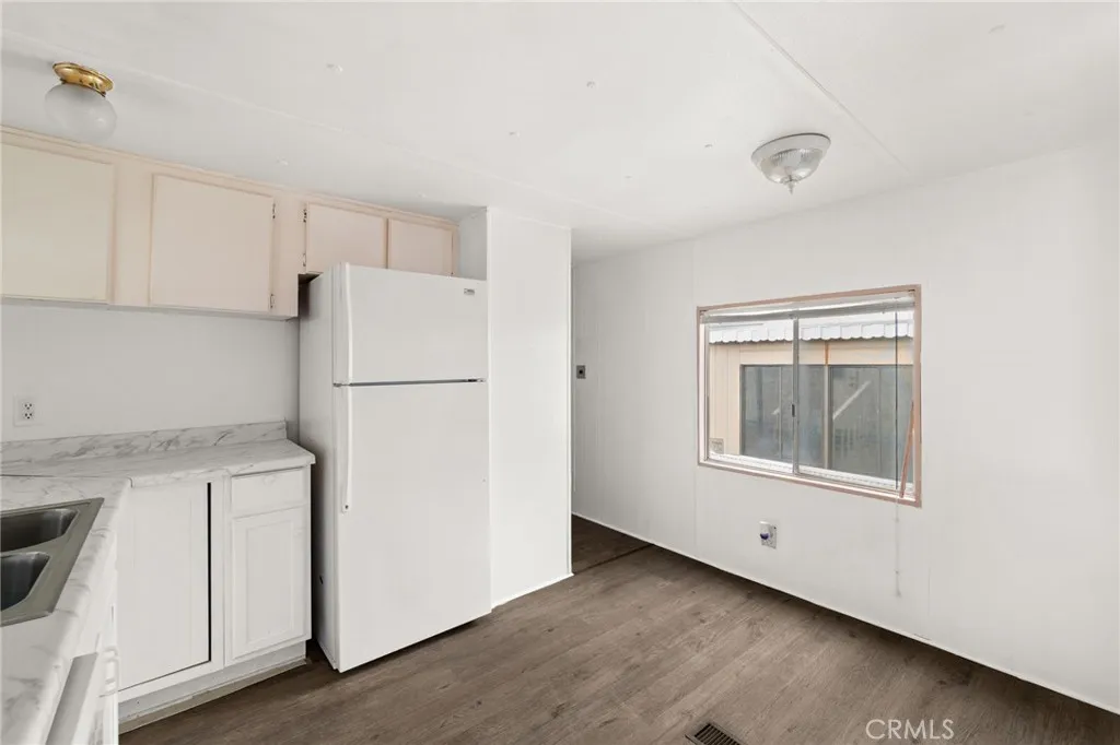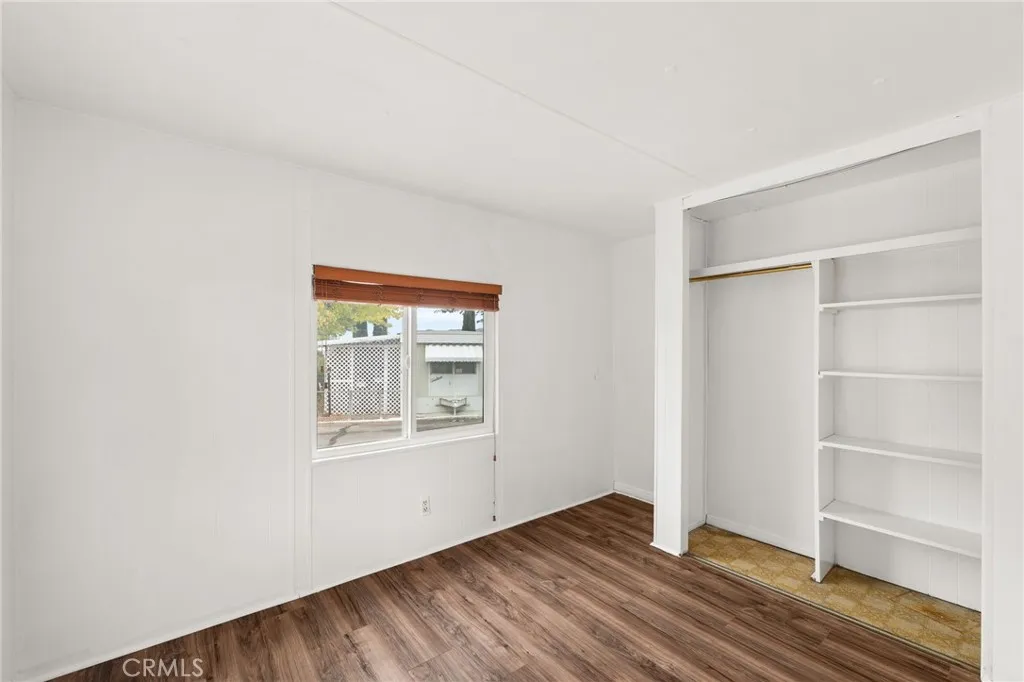 Affordable turnkey home in in the quiet Juniper Senior Park! This two bedroom home is as comfortable as they come, with recently updated kitchen and bathroom. Enter in through a enclosed patio, great for your potted plants and morning coffee lounging. A spacious living room includes a wall mounted swamp cooler which keeps the home nice and cool during those summer months. A pass through takes you to the recently updated kitchen complete with newer sink and dishwasher. Down the hall sits the recently updated bathroom with accessibility features such as a walk in shower and sink with hand holds. Indoor laundry is offered within the bathroom with laundry hookups adjacent to the shower and additional storage above for all your laundry needs. Lots of privacy in each bedroom, as they sit at opposite ends of the home. The primary bedroom enjoys it's own wall mounted AC unit for added nighttime comfort. Windows throughout the home have been recently replaced, home has also been earthquake braced and sewer line has been replaced. This corner lot space enjoys a larger yard space then it's neighboring homes. A large gated lawn space is great for a pet (check with the park for breed restrictions). Excellent location, a walkable distance to Stater Bros Market and local dining and shopping.
