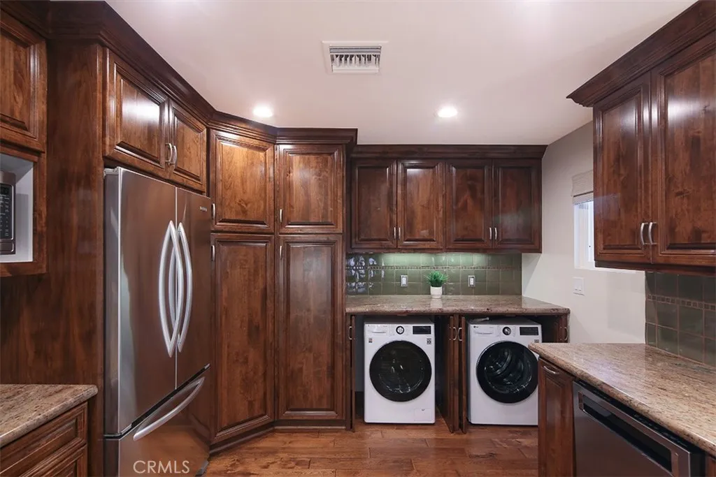 Welcome to this warm and inviting retreat situated on a peaceful cul-de-sac in north Monrovia, well above Foothill Boulevardwhere timeless charm meets modern comfort. First time on the market in over 45 years, this home has been lovingly cared for by its owners, showcasing true pride of ownership and great curb appeal. This beautifully maintained 4-bedroom, 2-bathroom home features high-quality engineered wood flooring throughout the entry, living room, kitchen, and dining area, complemented by plush frieze carpeting in all four bedrooms. Thoughtful upgrades include full copper plumbing, plantation shutters on all bedroom and living room windows, and custom shades on the kitchen windows and dining areas sliding door. Each of the four bedrooms is enhanced with new ceiling fan light fixtures with remote control, adding comfort and convenience throughout. The kitchen is a standout, equipped with high-end stainless steel KitchenAid appliancesincluding the oven/range, range hood, dishwasher, and refrigeratorand enhanced by custom cabinetry with pull-out drawers, soft-close features, and concealed space for the conveniently located laundry machines behind matching cabinet doors. The entryway, dining area, and kitchen feature recessed lighting, creating a bright, contemporary atmosphere. A dual-zone HVAC system provides personalized comfort on both levels, while the freshly painted interior and newer exterior paint add to the homes move-in-ready appeal. The well-designed layout offers a ground-level primary suite, a spacious galley kitchen that flows seamlessly into the dining are