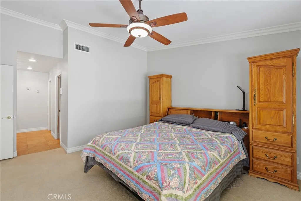 Discover the allure of Canyon Hills, a highly coveted community of only 62 homes tucked against the beautiful Sycamore Canyon hills. Ideally located in Riverside, you're just minutes from UCR, the Canyon Crest Town Center, and convenient transportation. Step inside this courtyard-entry home to be greeted by a dramatic, open living space featuring vaulted ceilings, elegant crown molding, and custom wood shutters throughout. The centerpiece is a cozy crystal rock gas fireplace, surrounded by plenty of natural light. The kitchen has been beautifully updated with French Country cabinetry, stone quartz counters, upgraded appliances, and a bright garden window. The kitchenette eating area features sliding doors leading to the side yard patio, perfect for outdoor dining. The home's layout is practical and well-appointed. Bedroom #1, positioned near the front courtyard, offers a spacious closet. Further down the hall, you'll find custom linen cabinets and the hall bath, which features a full tub/shower combo and natural light from a solar tube. Bedroom #2 includes views of the back patio and a convenient walk-in closet. The main bedroom is a spacious retreat with a vaulted ceiling and direct patio access. Indulge in the spectacular main bathroom, showcasing a walk-in shower with a skylight and a custom quartz counter that is dramatically lit from beneath. Enjoy the low-maintenance outdoor space with multiple private patios and pathways, a lush, private hillside backdrop, and artificial grass. The indoor laundry room provides a sink and storage, and the garage offers extensive cabin