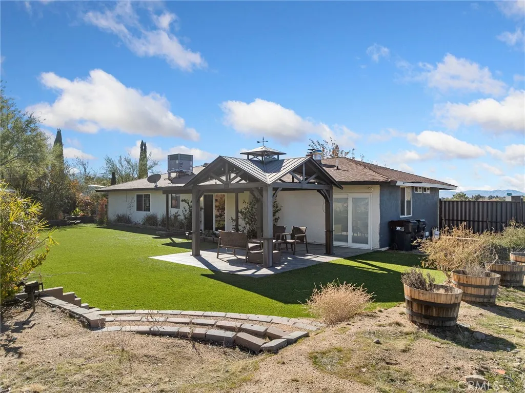 Welcome to this beautifully updated home located in a quiet neighborhood. Spacious living room with plenty of natural light coming in. Gas fireplace for those cold, winter nights. Kitchen features modern appliances, quartz countertops, and a spacious island with storage cabinets. New epoxy flooring. The landscaped front and backyard offers privacy bushes, artificial turf, two gazebos, desert scape, and multiple fruit trees (peach, pomegranate, cherry, pears, plum, apricot, and grapes). Sale of this home includes the adjacent parcel so you have over an acre of land. Corrugated metal fence for privacy. There are two sliding doors wide enough to fit your toys. With 360-degree mountain views, gorgeous sunsets, and access to hiking just steps from your backyard, this home is a true desert gem. Conveniently located near local attractions and recreational destinations. THIS HOME IS ALSO ELIGIBLE FOR 3% DOWN NO PMI PROGRAM.