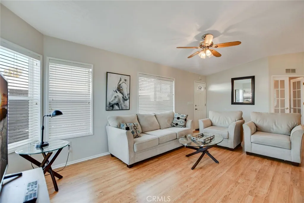 Well-maintained 2 bedroom, 2 bathroom home with a separate den/office, located in The Fountains, a 55/45+ age restricted community in La Verne. This property features a permitted 160 sq. ft. expansion located in the secondary bedroom, with the expanded area measuring approximately 10' x 16'. The home includes an open floor plan, high ceilings, and areas of the property provide views of the San Gabriel Mountains. Interior features include laminate flooring throughout with waterproof flooring in the restrooms, a large kitchen with bay window and eating area, and an included French-door refrigerator. Additional features include a laundry room with sink, newer toilets, dual-pane windows, and a 100 AMP electrical panel. Improvements include a roof replaced approximately two and a half years ago (July 2023) and a part of the driveway was replaced recently. An Italian lemon tree is located on the property. Community amenities include a clubhouse, banquet room, kitchen facilities, swimming pool, spa, shuffleboard area, gym, and dog park. The extra-wide street in front provides convenient vehicle access. Furniture and personal property are included with the sale, excluding items specified by the seller. Buyer must be approved by Park Management.