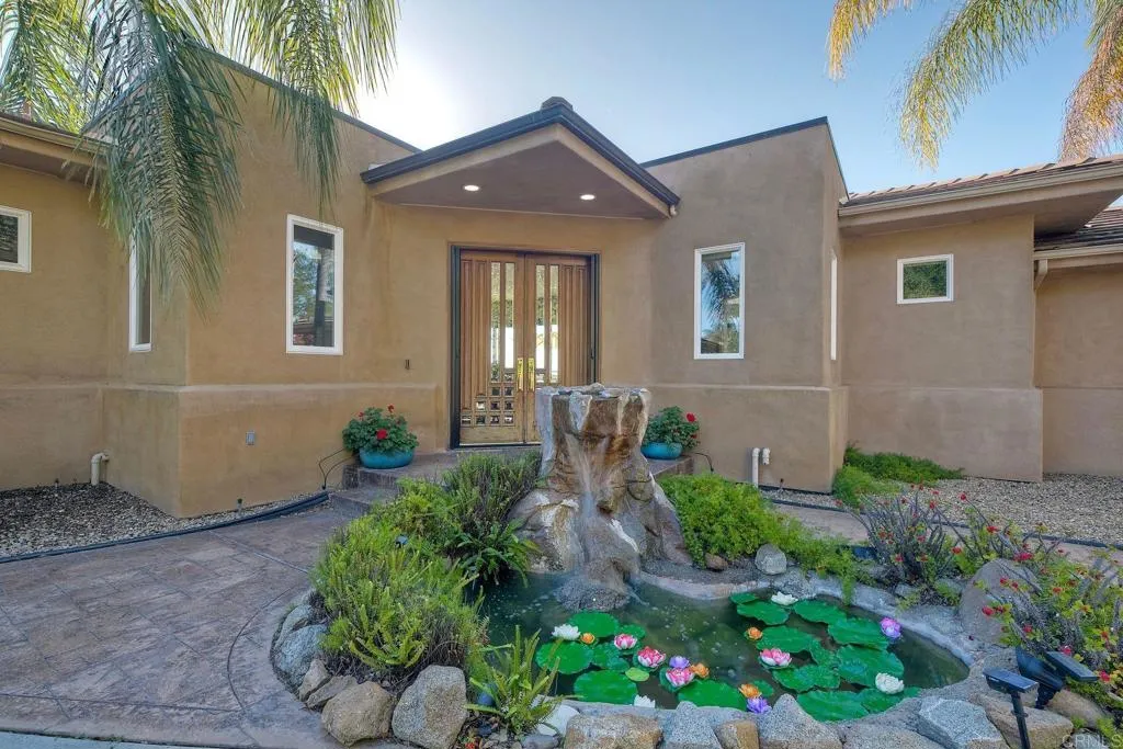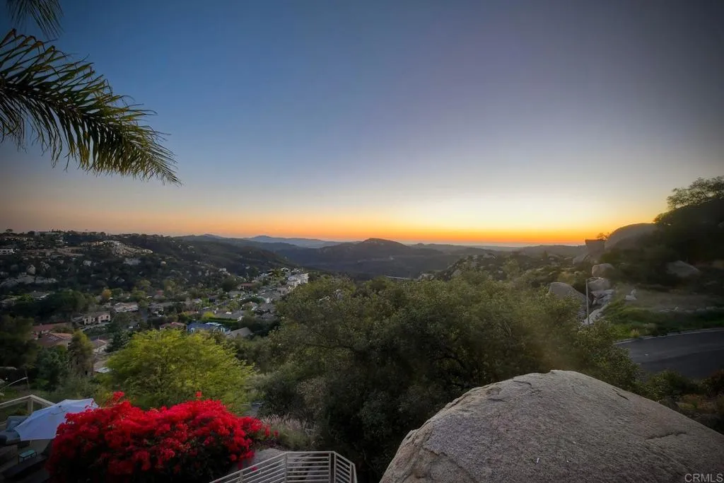 Perched high in the boulders of Hidden Meadows, this custom home feels like youre living above it allliterally. From sunrise to sunset, the soaring panoramic views stretch across rolling hills to the ocean and islands beyond. These are the kind of huge views that make every day at this incredible Propertunity feel like a vacation! The stylish and smart floor plan flows effortlessly from room to room. The interior features rich wood flooring, lots of natural sunshine, and recessed lighting. The kitchen and living room open to a large view deck, perfect for morning coffee, sunset dinners, or an evening glass of wine while the sky puts on a show. The living room is anchored by a gorgeous fireplace with modern stone surround, while the kitchen boasts handsome wood cabinetry, granite counters, and gleaming stainless steel appliances. The primary suite is a retreat of its own, complete with private deck access, a romantic fireplace, a spa-like ensuite bath, and the spacious custom closets youve always dreamed of having. The lower level boasts a versatile den or office area with its own fireplace, built-in wood shelves, and desk nook, and access to the pool/patio area via elegant glass French doors. Two large ensuite bedrooms (primary-like in size, with walk-in closets) and an additional theatre room (currently configured as an office and home gym, could be optional 4th bedroom) on this level offer extra flexibility for guests or multi-gen living. Outdoors, you'll be living the entertainers dream with a resort-style pool featuring a tranquil view spa, plus a waterfall you can actu